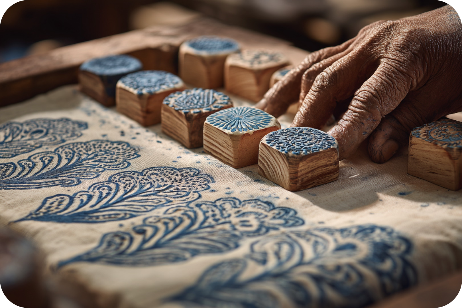 Hand Block Print is a craft where artisans press hand-carved wooden blocks into dye and stamp them onto fabric to create repeating motifs. Each impression is placed by eye and hand, building the pattern one block at a time. The result is a distinctly human texture with slight, beautiful variations you can see and feel.